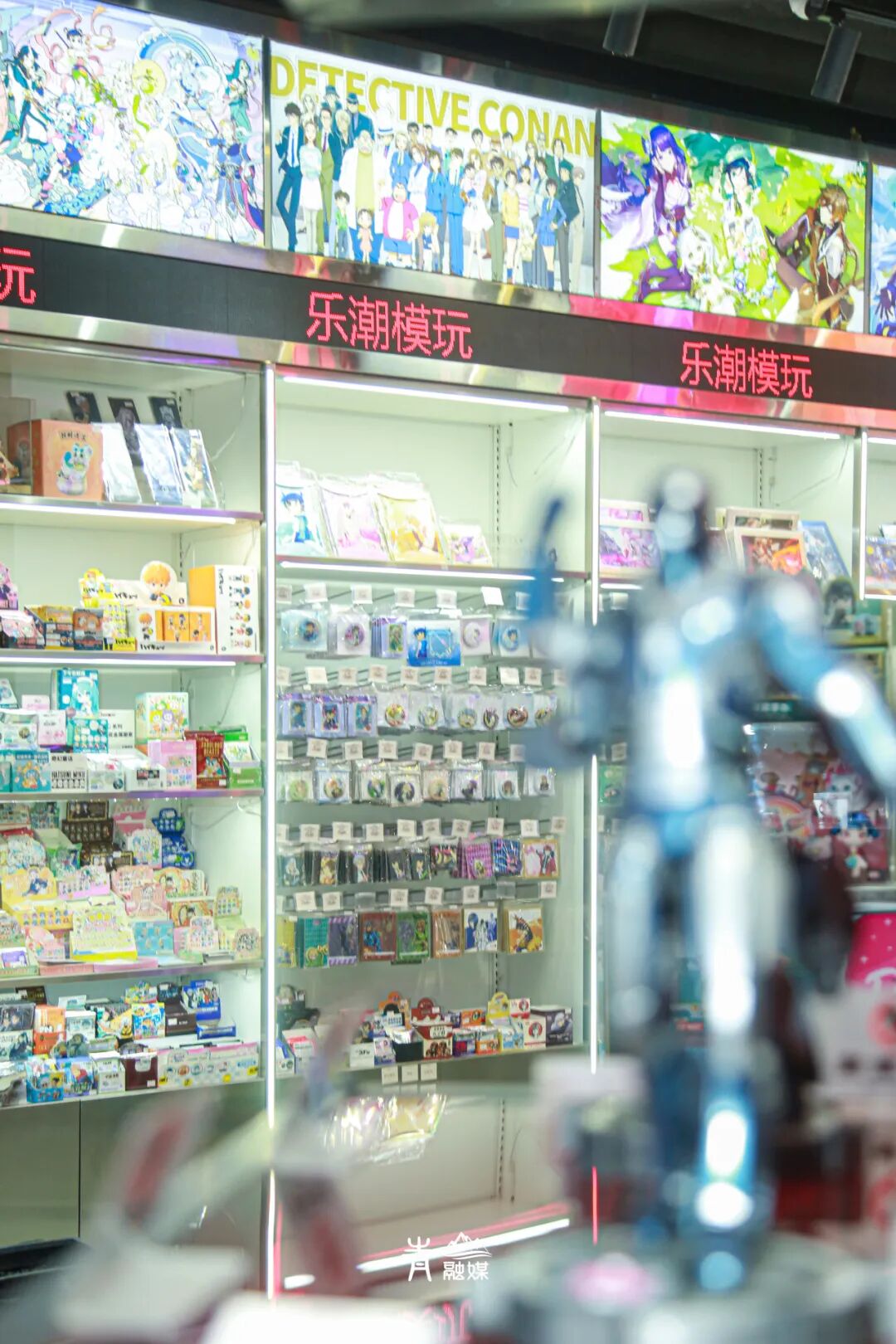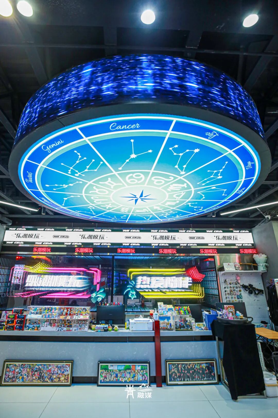 这只是「乐潮模玩」献上的重磅开胃菜,精彩远不止如此。走进店内,首先映入眼帘的是五彩的发光字样,印着「乐潮模玩」四个大字。抬头一看,天花板上绘制着魔法阵,异次元气息拉满。