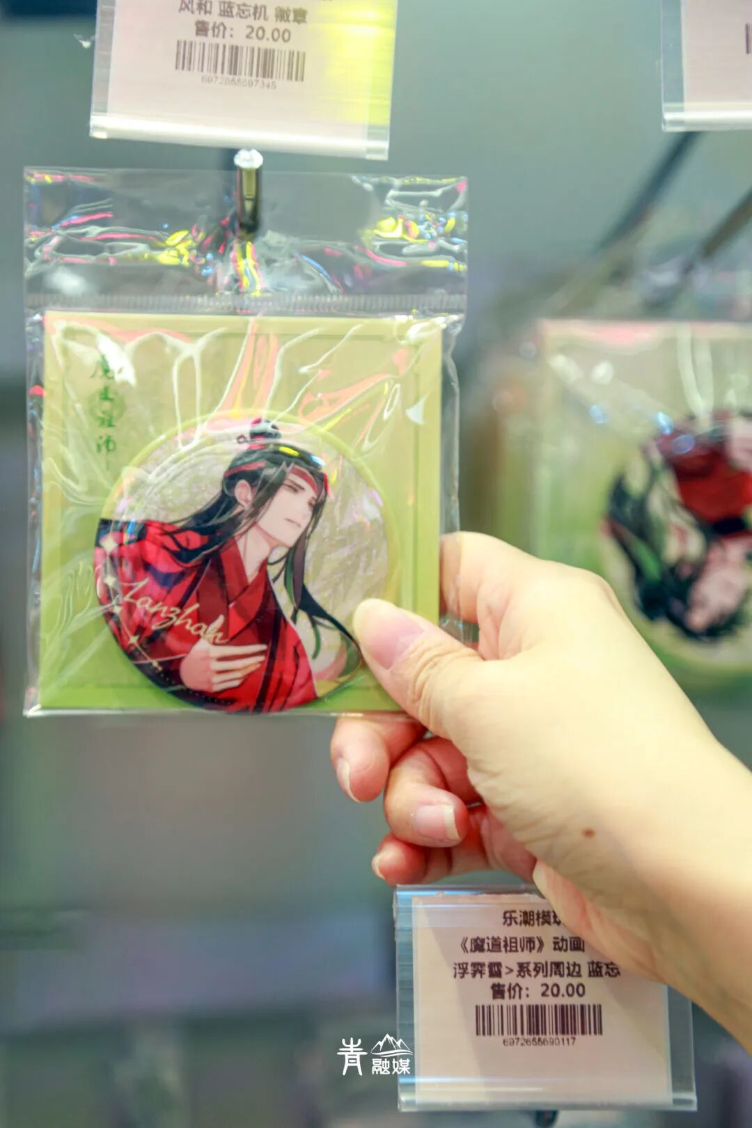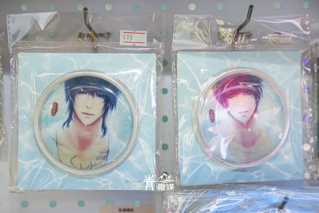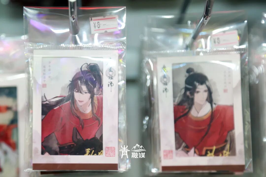 谷子区里:国漫《魔道祖师》《非人哉》《全职高手》《一人之下》等大热IP的谷子整齐排列在墙上,拍立得、人物立牌、吧唧、色纸……蔚为壮观。