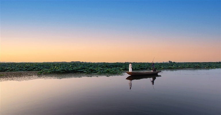 如今泛舟湖上,划船大叔会热情地指着芦苇丛介绍:“那岛上的‘野鸭子’,可不怕人!”只见白鹭优雅地掠过水面,菱角在碧波中轻轻浮沉。每年六七月,“接天莲叶无穷碧,映日荷花别样红”的盛景便在这里上演,满湖荷叶层层叠叠,一望无际,粉色的荷花在绿叶的簇拥下娇艳绽放,美不胜收。