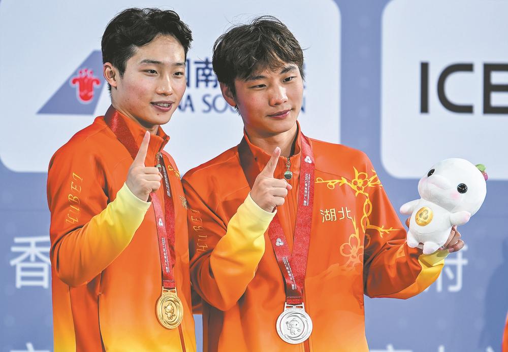 11月10日,获得冠军的王宗源(左)与获得银牌的湖北队队友郑九源在颁奖仪式上合影。(来源: