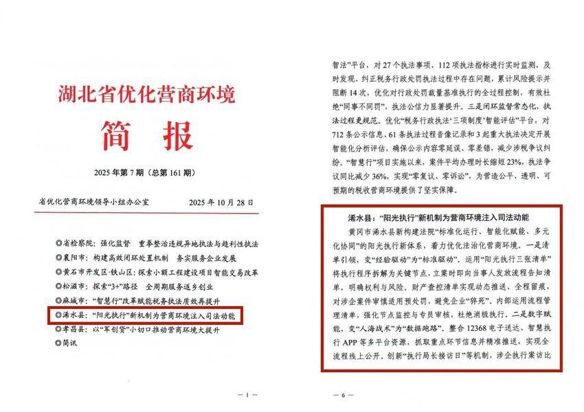 湖北日报客户端讯(通讯员刘琦)近日,浠水县人民法院创新的“阳光执行”工作机制,被《湖北省优化营商环境简报》2025年第7期刊发推广,标志着该院优化法治化营商环境的经验做法获得省级认可。