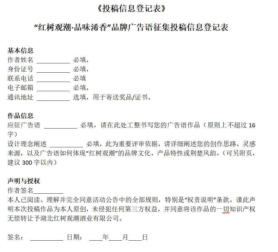 为全面提升“红树观潮”品牌形象,深度挖掘其独特的鄂东文化与新派酱香内涵,现面向全社会发起品牌广告语有奖征集活动。我们期待一句能与“钻石恒久远,一颗永流传”比肩的经典文案,让“红树观潮”成为传唱四方的浠水酱香名片。