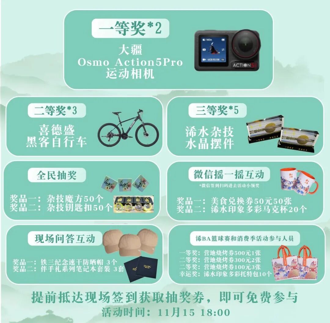 福利抽奖送不停:大疆运动相机、品牌自行车、精美文创礼品、时光营地消费券等超1万元奖品,多轮抽奖+互动问答,人人有机会抱奖回家!