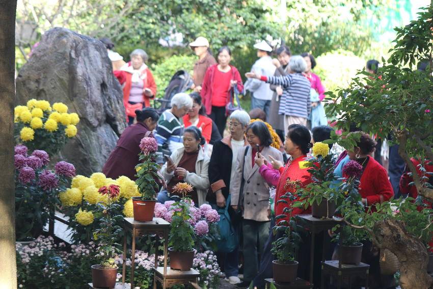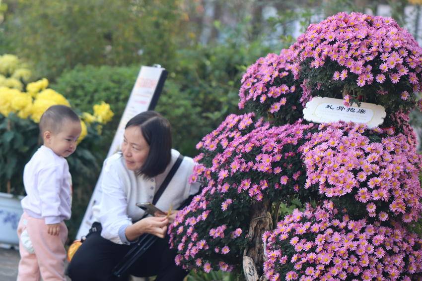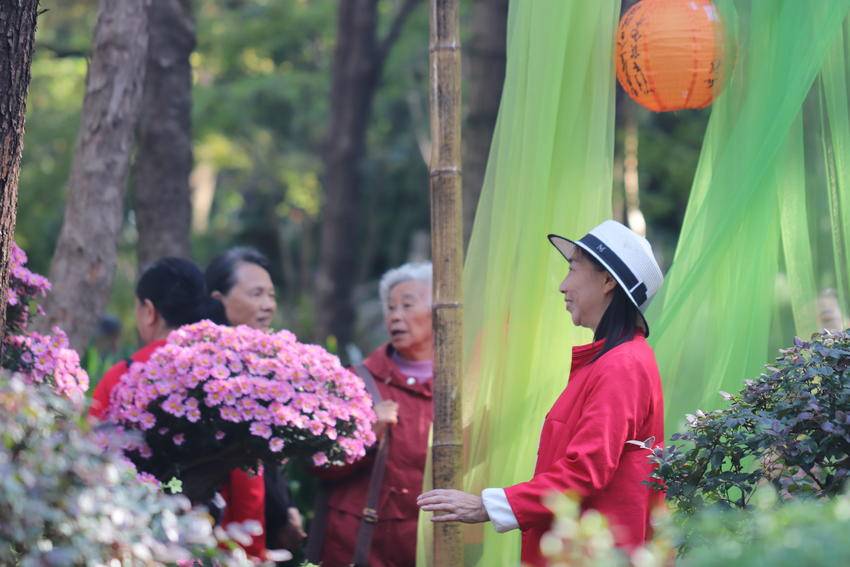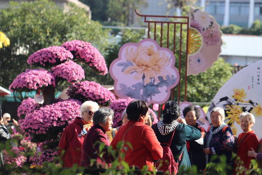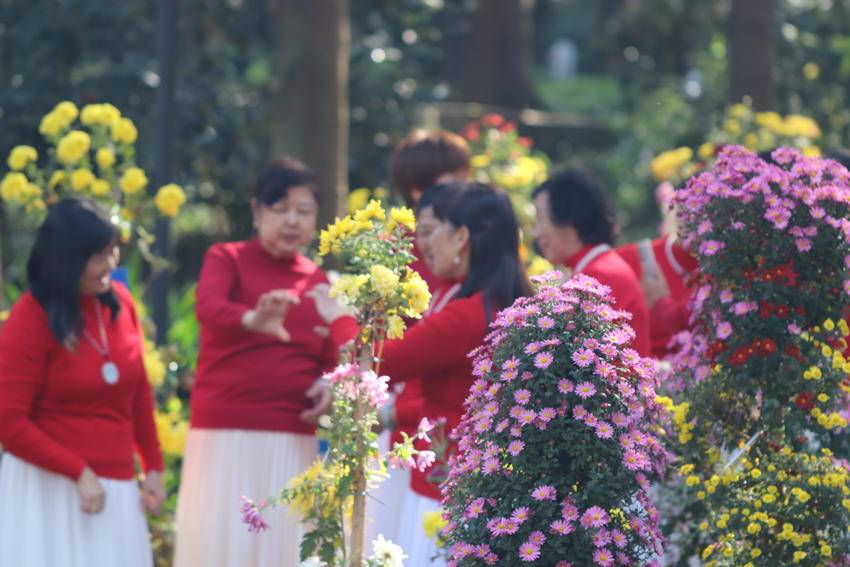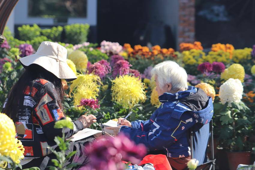 现场人气爆棚、热闹非凡:文艺爱好者支起画板,以笔为媒勾勒秋日菊韵;家长们牵着孩子穿梭花丛,在沁人花香中解锁温馨亲子时光;而最亮眼的当属打卡主力军——阿姨们,她们身着靓丽服饰,手持丝巾、墨镜等“拍照神器”,在花丛中灵活切换各式灵动造型,或单人浅笑定格、或三五成群并肩合影,爽朗的笑声与灿烂的笑容交织回荡,比盛放的菊花更具感染力,成为现场一道独特的风景线。