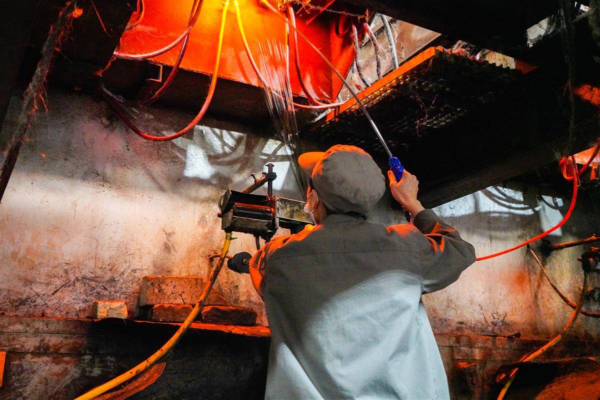 11月11日,记者在襄阳汇尔杰新材料科技股份有限公司车间看到,机器将玄武岩矿石倒入熔炉,经过1600℃的高温,碎石变成了“水”,熔炉下方出料口“吐”出一根根“细丝”。这些“细丝”就是玄武岩纤维,能抵抗1200℃高温。