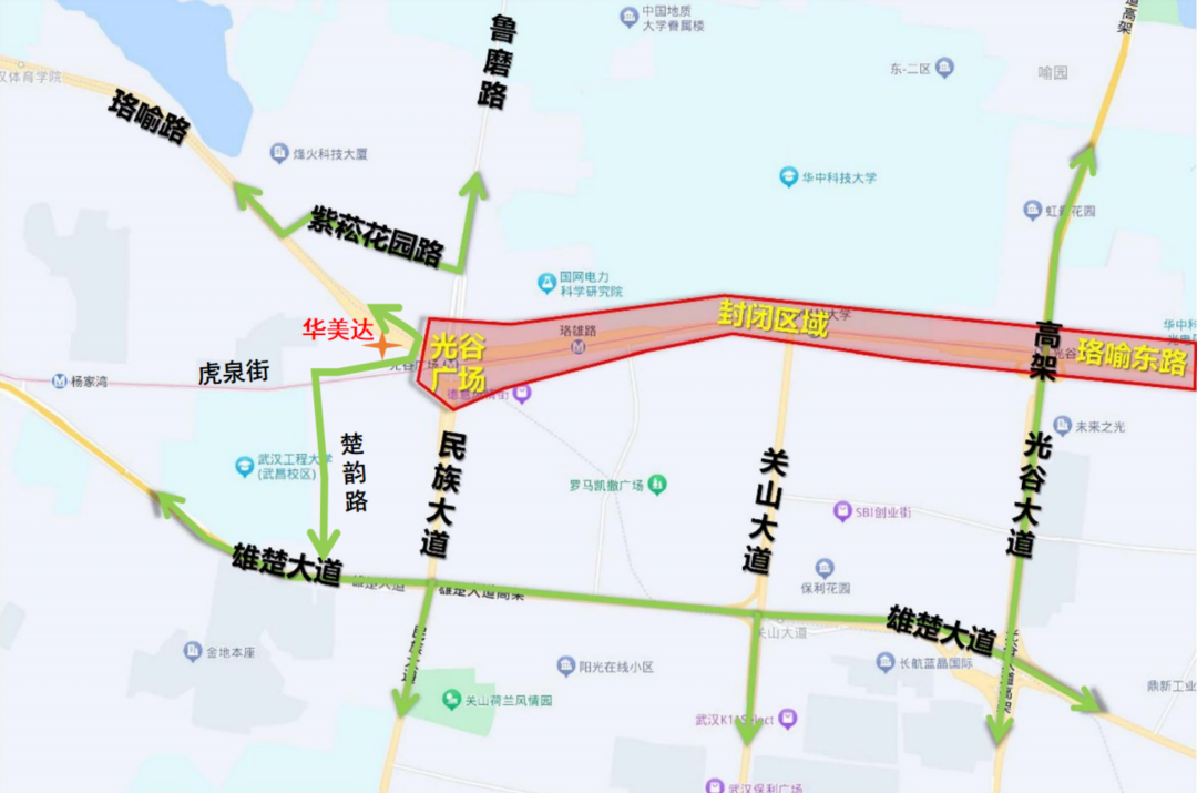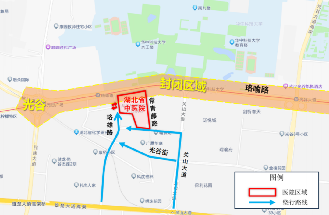 绕行路段:需通行以上管制路段前往光谷转盘方向车辆请绕行喻家湖路、光谷高架、雄楚高架、雄楚大道、紫菘花园路、邮科园路、楚韵路、卓刀泉南路。