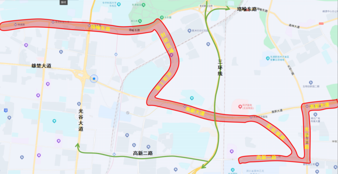 2、原需通行光谷一路(珞喻东路至高新大道路段)、高新大道南侧辅路(光谷一路至科创南路)。
