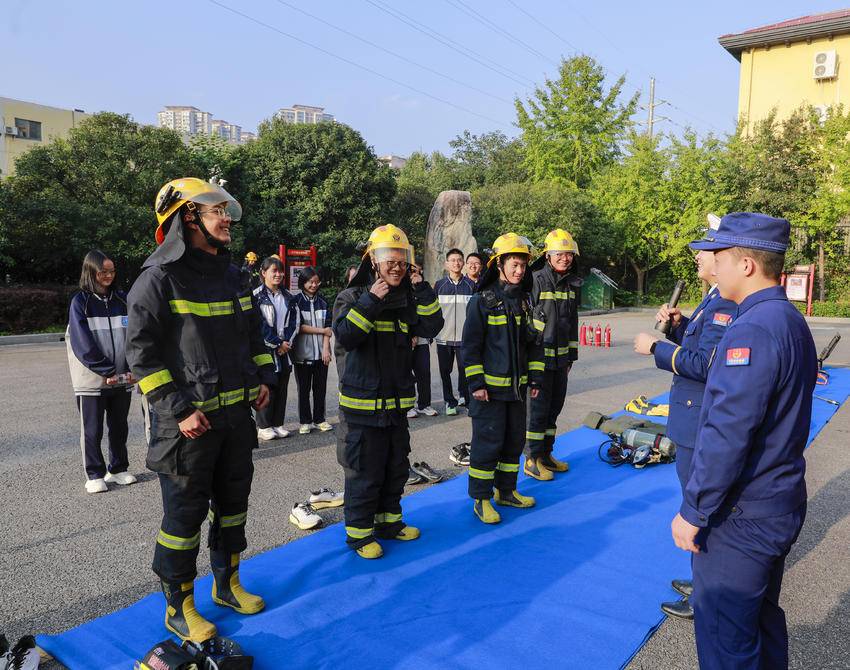 活动现场,师生们在消防员引导下依次参观消防车辆与专业装备,亲身体验防火服穿戴流程与灭火器操作步骤,认真学习并掌握核心应急技能。