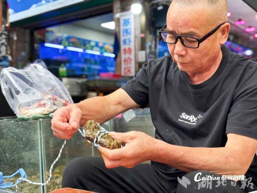 在建新菜场水产区,螃蟹摊位前人头攒动,摊主们忙着将不同规格的螃蟹分拣装箱,供顾客挑选。“最近每天能卖出两百多斤,周末销量还能翻倍。”兰鲸生鲜俞老板介绍,从5月的“六月黄”到眼下的黄金季节,蔡甸大闸蟹已进入膏满黄肥的盛产期,品质优良,供不应求。