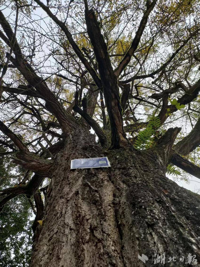 根据《湖北省古树名木保护牌》等信息,笔者得知这株银杏古树编号为42282600170,树龄在420年以上,树高24.1米,胸围472厘米,保护级别为二级。