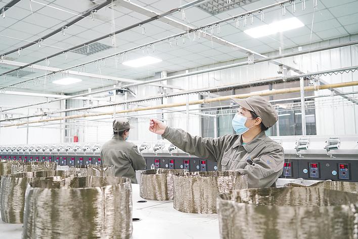 11月11日,襄阳汇尔杰新材料科技股份有限公司车间内,机器将玄武岩矿石倒入熔炉,经过1600℃的高温,碎石变成了“水”,熔炉下方出料口“吐”出一根根“细丝”。这些“细丝”就是玄武岩纤维,能抵抗1200℃高温。图为员工正在生产线上忙碌。