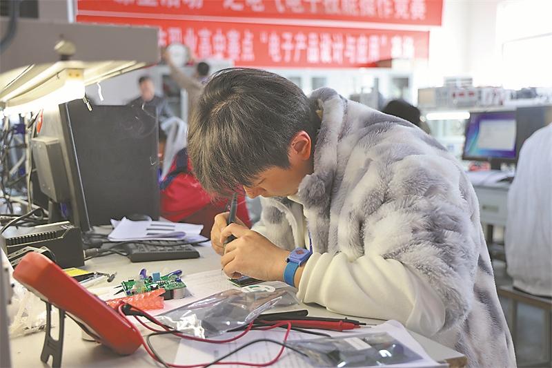 据介绍,在电子产品设计与应用赛道上,通过理论加实操考核选手对电子电路的装接、PCB电路制作等能力。(来源:襄阳日报 郑潘 李瑞 摄)