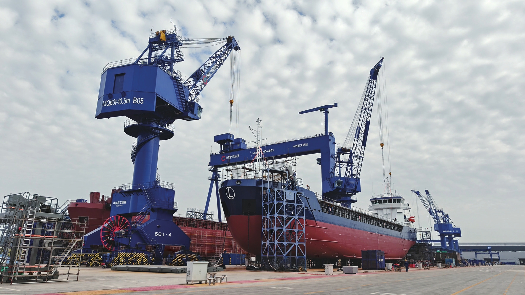 11月13日,位于宜都市陆城街道太保湖村的宜昌产投(宜都)绿色智能船舶产业园一片繁忙,首个入园企业宜昌达门船舶有限公司订单充足,目前已有20艘船舶的订单,正加班加点生产。图为即将交付德国的多功能集装箱船。该船长89米、宽12.5米,核定载重3850吨,装有风帆助力系统,可省油约40%,属于绿色船舶,工人们正在做最后的下水调试工作。(孙玉敏 摄)