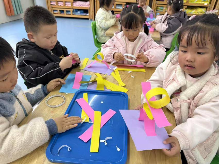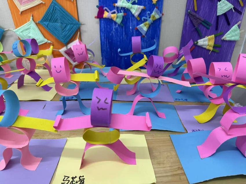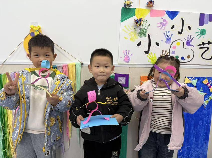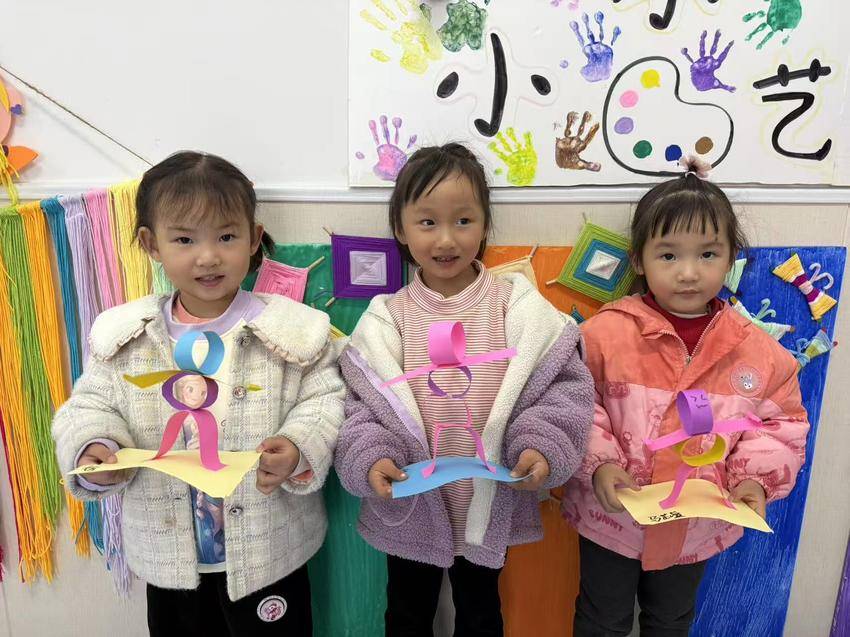 墙上“小小艺术家”主题板的手印画,和桌上摆满的纸扭小人相映成趣。有孩子把小人举到脸旁“对表情”,还有的让小人“手拉手”排起队。“我的小人物叫‘开心怪’!”攥着作品的小朋友晃着脑袋,连眼睛都笑成了月牙。