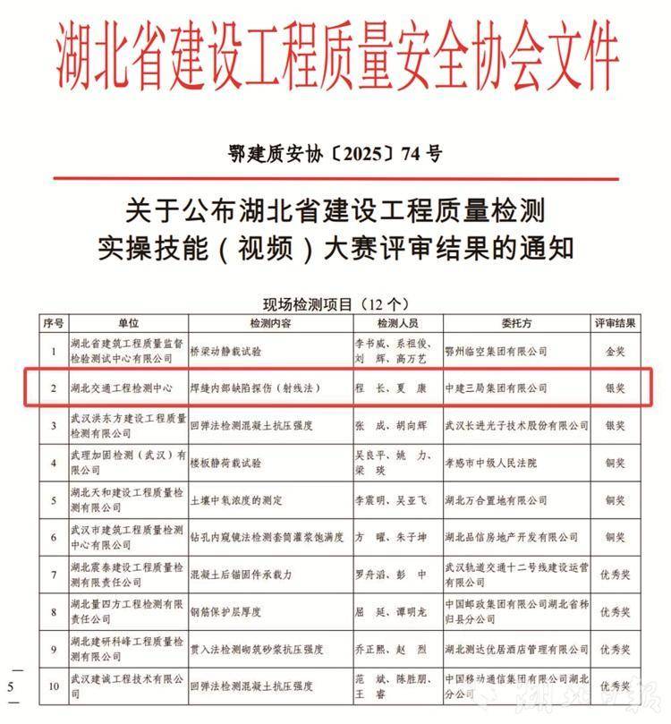 湖北日报客户端讯(通讯员陈娜、叶忠浪)近日,湖北省建设工程质量安全协会发布《关于公布湖北省建设工程质量检测实操技能(视频)大赛评审结果的通知》,智能检测公司所属交通检测公司报送的《基础与结构部承担焊缝内部缺陷探伤(射线法)》项目荣获大赛银奖。