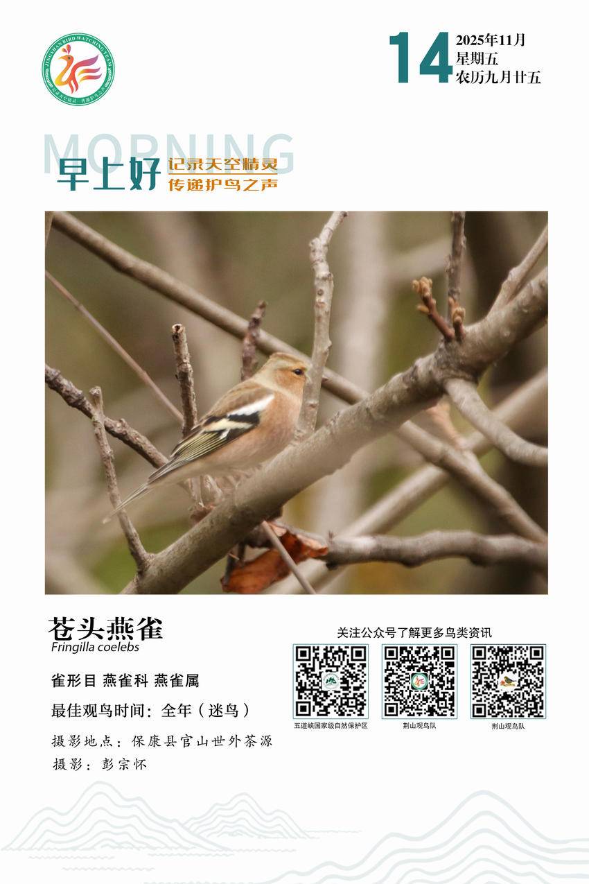 苍头燕雀(英文名:Eurasian Chaffinch,学名:Fringilla coelebs),是雀形目燕雀科燕雀属的鸟类。分布广泛,从欧洲西部至伊朗和土库曼斯坦,是中国北部地区常见的鸟类。雄鸟色彩鲜明,头顶淡蓝色,背部赭褐色,腰部微绿,面部和胸部呈粉红色;雌鸟则为绿褐色。叫声独特,除繁殖期间成对活动外,其他季节多成群,迁徙时尤为明显。(湖北五道峡国家级自然保护区管理局)