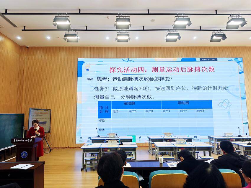 课例点评后,北辰小学瞿杰老师带来《呼吸器官》的“无生授课”说课展示:她以“吹毛线”的体验式导入开篇,通过“体验憋气”“测量呼吸次数”等无生互动设计,清晰呈现教学逻辑——从“测量呼吸次数”到“测量脉搏次数”,从“运动前”到“运动后”,全程无语言却以直观设计传递了教学重点,创新形式获得现场教师的一致好评。