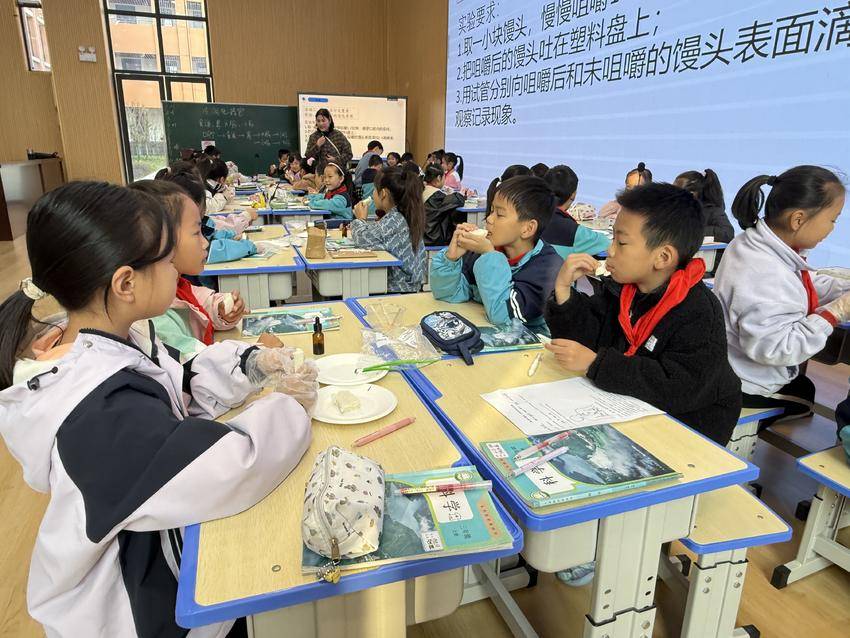 谷山学校范艳杰老师《消化器官》:以“吃下去的食物去哪了”为趣味导入,借助人体消化器官模型、动画演示,带领三(1)班学生直观认识口腔、食道、胃等器官的功能。课堂上,学生通过“馒头大挑战”的小组实验,亲身体验口腔对食物的作用,在动手操作中理解“口腔是食物消化的第一站”的科学概念。