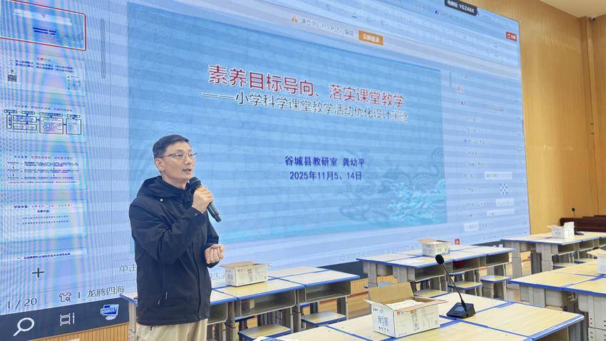 谷城县教研室科学教研员龚幼平老师围绕“怎样备好、上好一节科学课”作专业的系统讲解,内容实用且逻辑清晰。他提出以“整体—部分—整体”的结构化思维推进单元备课。强调科学课教学需理清基本要素与影响要素的关系,指出教师是“主导者”、学生是“主体”,二者通过课程、教学内容形成互动闭环。提出科学课堂教学活动应该按“情境引入—探究实践—拓展应用”三阶段展开,并明确各阶段的设计原则。整场讲座从备课逻辑到教学落地,再到资源配套,形成了完整的科学课教学指导体系,对一线教师的教学优化很有启发。