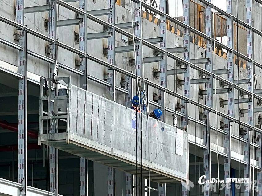 同济医院转化医学大楼实现主体结构封顶后,现已全面转入装饰装修与机电安装阶段。现场56台吊机协同作业,工人们正紧锣密鼓地进行外墙龙骨安装,幕墙工程总体进度达40%。据中建三局项目副经理邓南亭介绍,项目部成立创优小组,强化全过程质量控制,实行“样板引路”,确保施工一次成优。目前,400多名工人正采用多工序穿插、资源精准协调与劳动力优化等先进施工模式,全力推进工程进度。