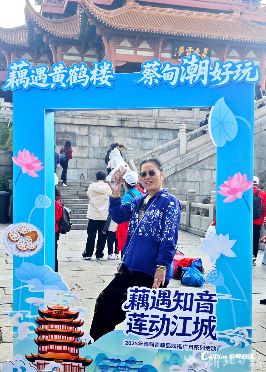 “国潮设计太出片。”游客李女士手持“蔡甸藕汤 四季飘香”标语牌拍照留念。莲藕主题打卡点前,游客纷纷合影并分享至社交平台,让“黄鹤楼下的蔡甸藕”话题迅速升温。