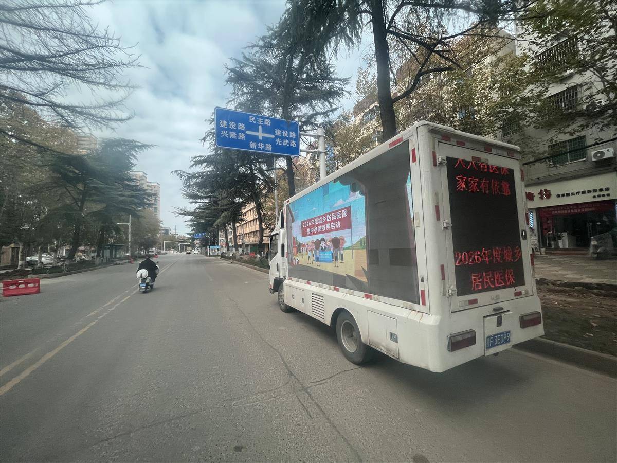 湖北日报讯(记者刘孝军、通讯员何力)为提升2026年度城乡居民医保政策知晓率、参保率,推动医保惠民政策落地生根,连日来,枣阳市医疗保障局创新宣传模式,启动医保宣传“直通车”巡回宣讲活动。一辆辆搭载LED流动屏幕的宣传车穿梭于全市17个镇(办、区)的集市广场、乡村小道、田间地头,以“文字+动漫”的直观形式,将参保标准、缴费渠道、待遇享受等核心政策精准送达群众身边,实现城乡宣传全覆盖,打通政策落地与参保服务的“最后一公里”。