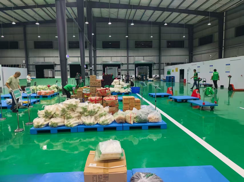 在分拣区,工作人员经过严格的手部消毒和体温测量后,开始对照各学校订单分拣食材。他们熟练地将新鲜蔬菜、肉类、禽蛋分类装筐,动作既迅速又轻缓,这些食材都将被赋予独特的“电子身份证”——扫描二维码即可追溯其产地、检测报告和运输轨迹。