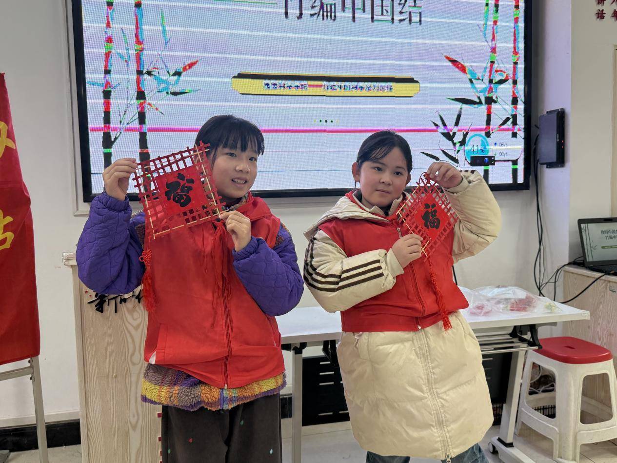 在动手实践环节,领到制作材料的同学们迫不及待地按照老师演示的编织步骤操作起来:先将红色竹篾交错编织成十字井字格底座,再小心翼翼地贴上福字,最后搭配中国结挂饰进行装饰。孩子们一边认真模仿,一边向老师和同伴请教如何梳理竹篾、调整结构。经过大家的共同努力,红色的竹篾搭配喜庆的福字与中国结,一个个色彩鲜艳、寓意吉祥的竹编中国结相继诞生。孩子们捧着自己的作品,爱不释手,成就感十足。
