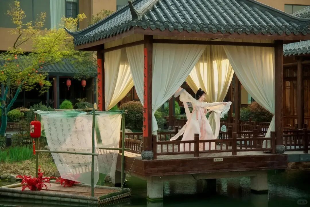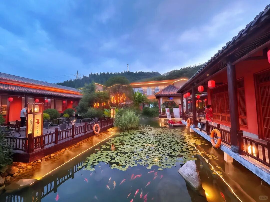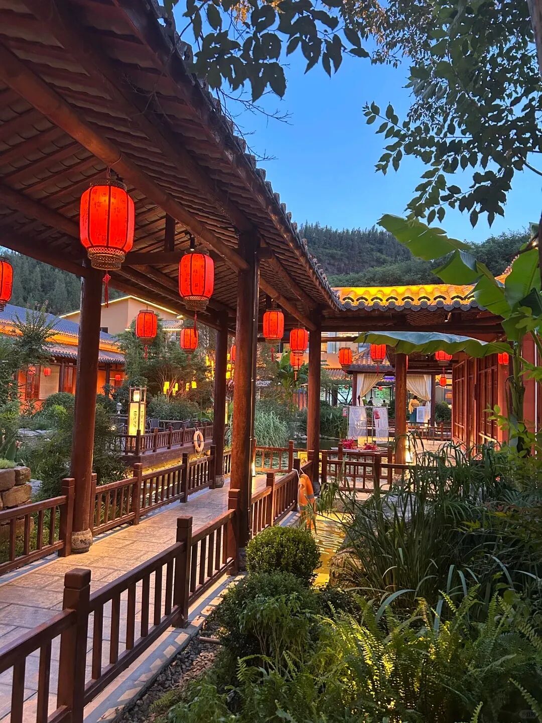 当夕阳的余晖褪去,庭院里的灯光瞬间点亮 !暖黄的灯笼映照着古建筑,水面上倒映着粼粼波光,树影婆娑…整个院子仿佛被施了魔法,浪漫、梦幻、静谧!