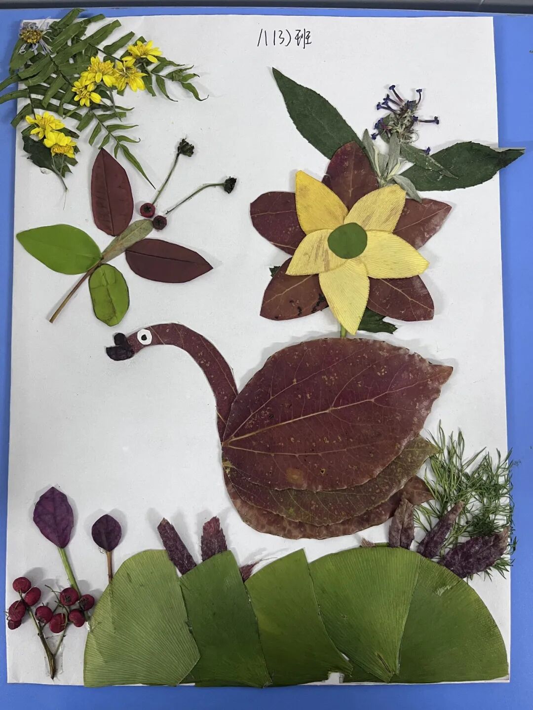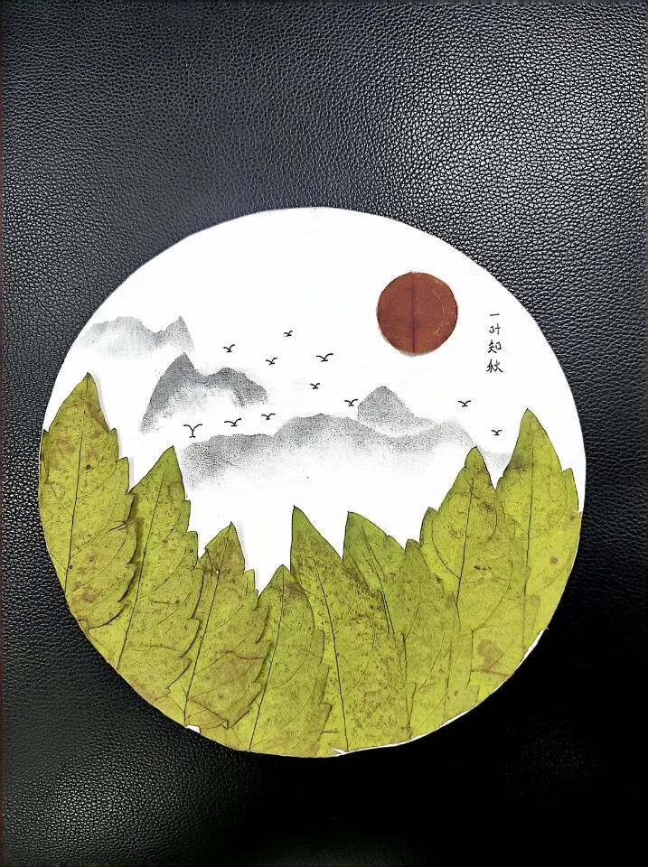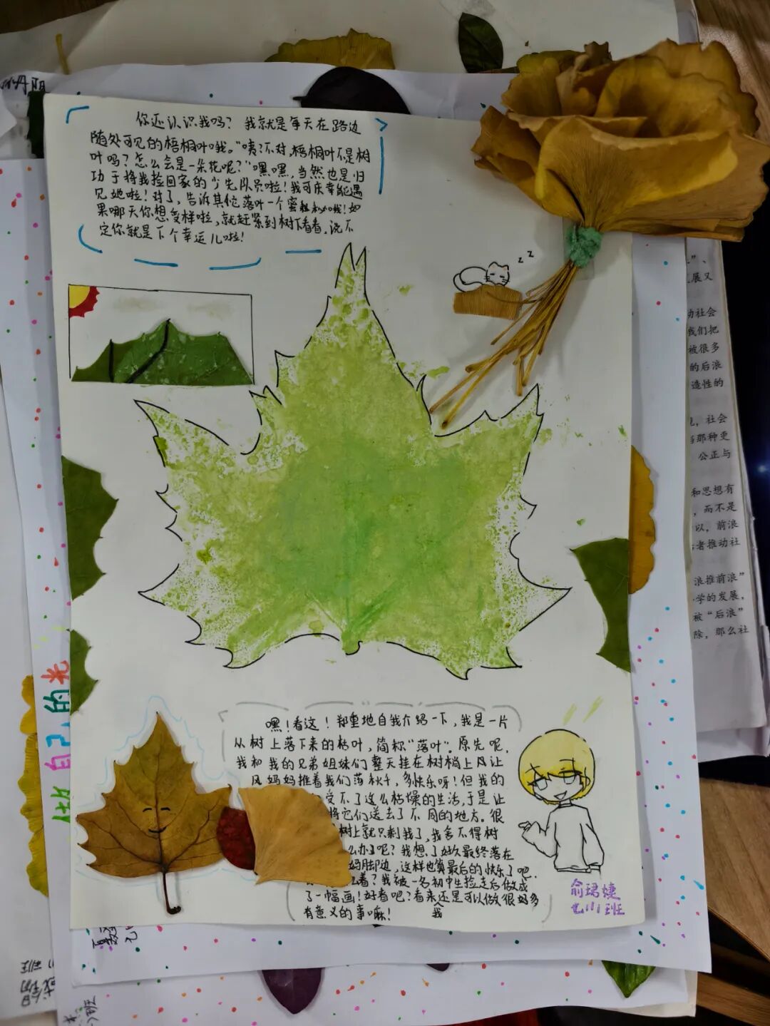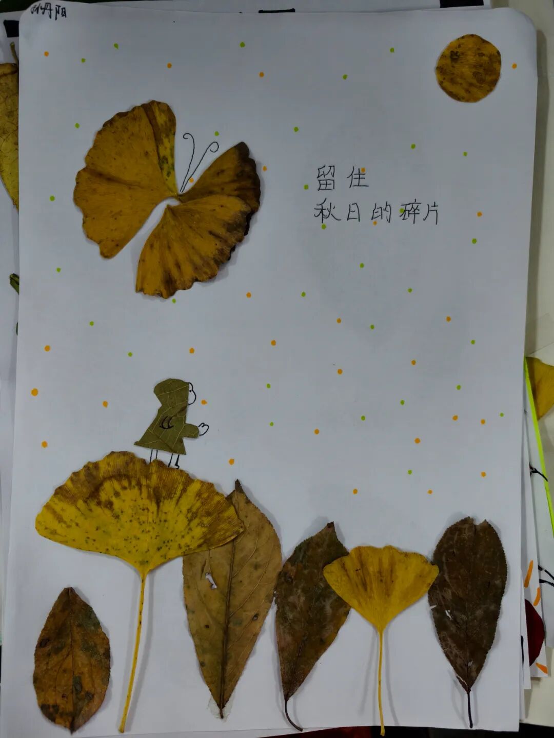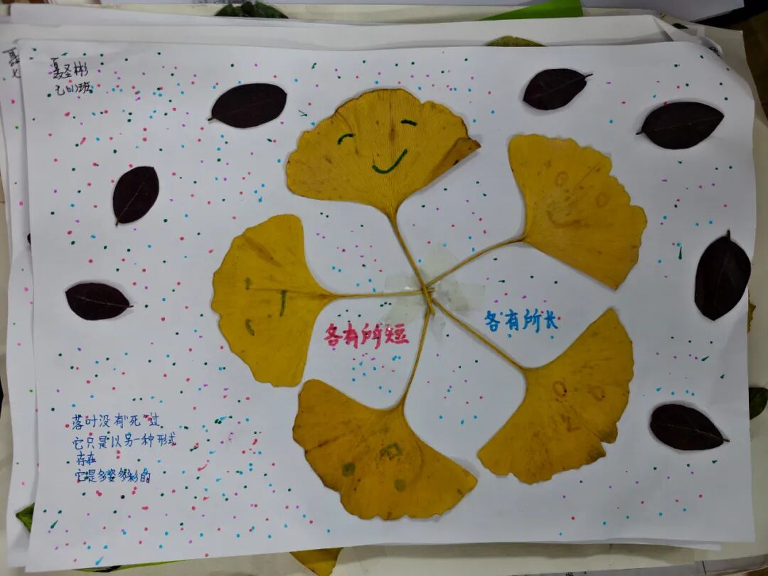 创作环节更是创意迸发。同学们将色彩各异、形态万千的落叶作为核心素材,借助拼贴、绘画、裁剪等巧思,让原本零落的树叶蜕变为一件件精美作品:银杏叶拼贴的蝴蝶振翅欲飞,枫叶勾勒的锦鲤寓意吉祥,梧桐叶裁剪的小船承载憧憬,还有用多种树叶组合成的“秋日森林”充满生机。“我把银杏叶拼成蝴蝶,就是想告诉自己,遇到困难就像叶子凋零,只要坚持,总能迎来‘破茧重生’的时刻。”张梓涵在作品旁写下这样的感悟。