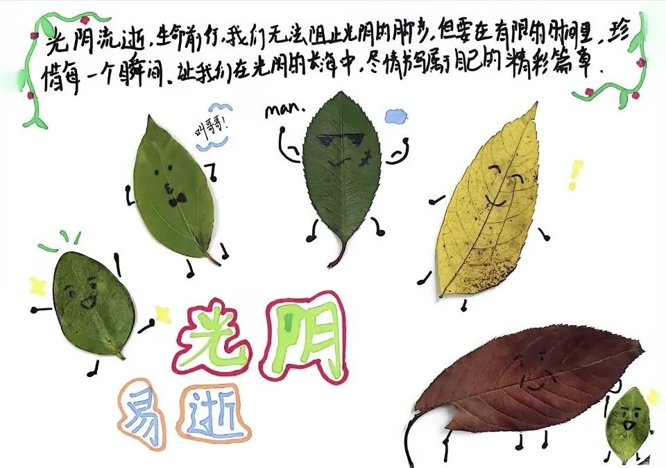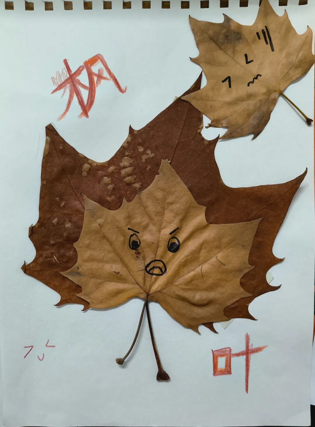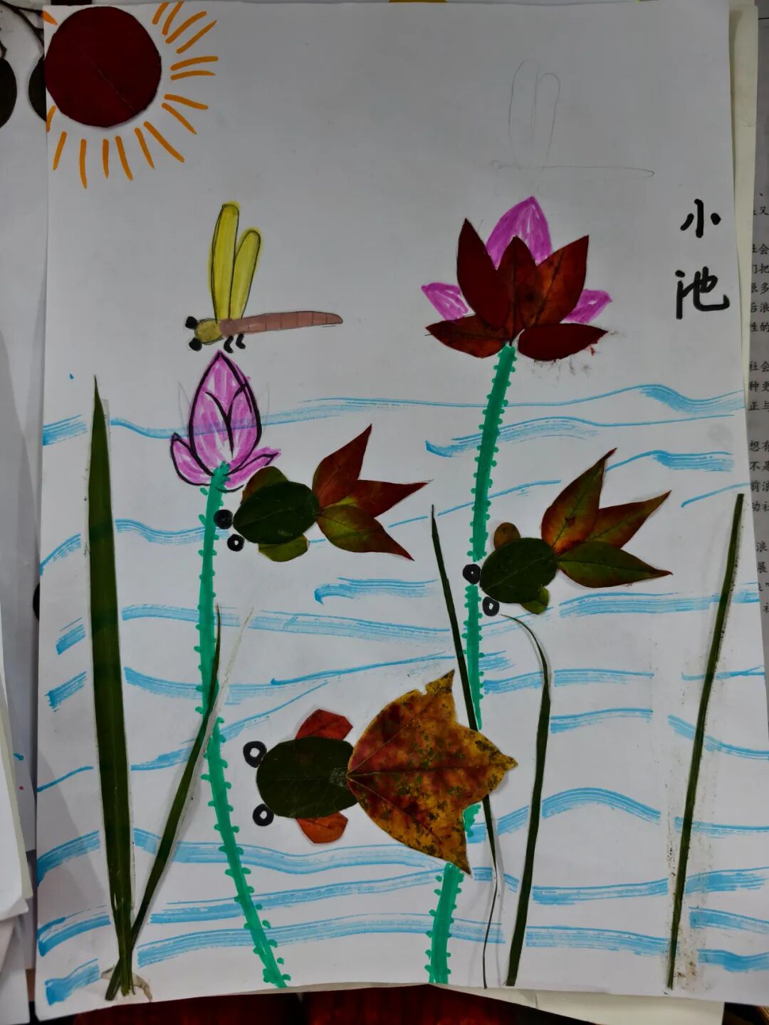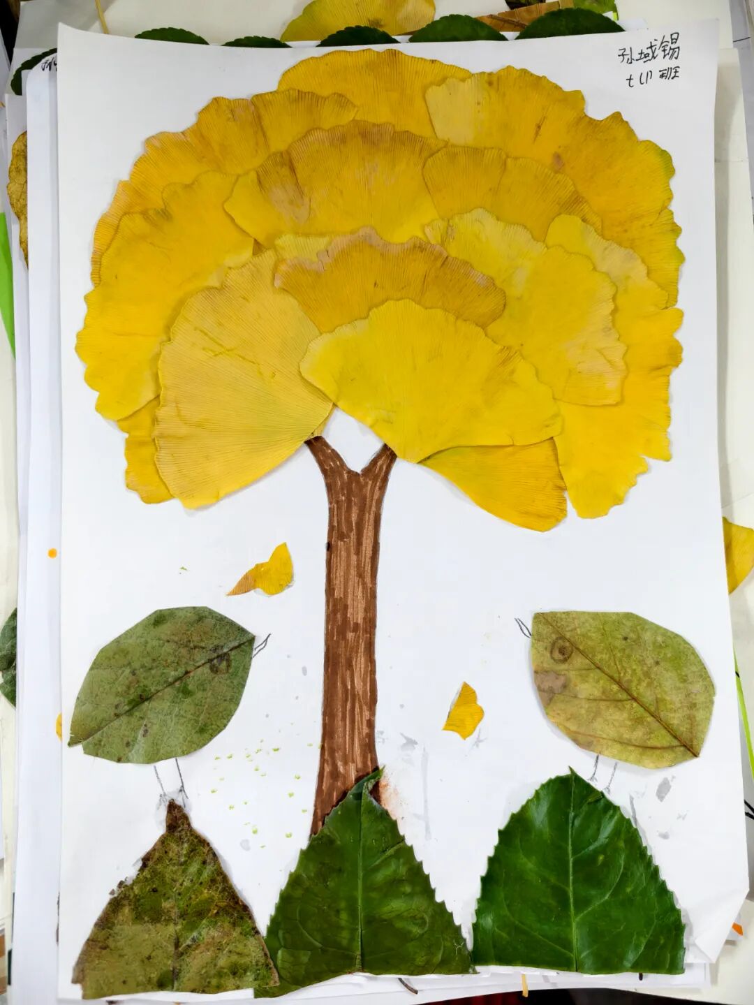 创作环节更是创意迸发。同学们将色彩各异、形态万千的落叶作为核心素材,借助拼贴、绘画、裁剪等巧思,让原本零落的树叶蜕变为一件件精美作品:银杏叶拼贴的蝴蝶振翅欲飞,枫叶勾勒的锦鲤寓意吉祥,梧桐叶裁剪的小船承载憧憬,还有用多种树叶组合成的“秋日森林”充满生机。“我把银杏叶拼成蝴蝶,就是想告诉自己,遇到困难就像叶子凋零,只要坚持,总能迎来‘破茧重生’的时刻。”张梓涵在作品旁写下这样的感悟。