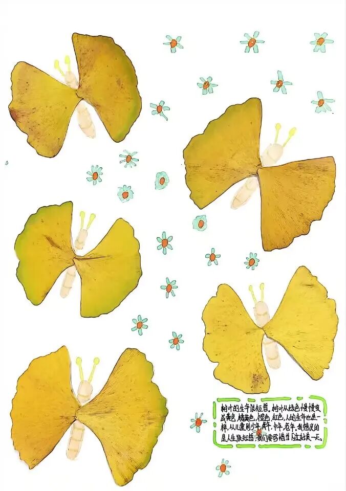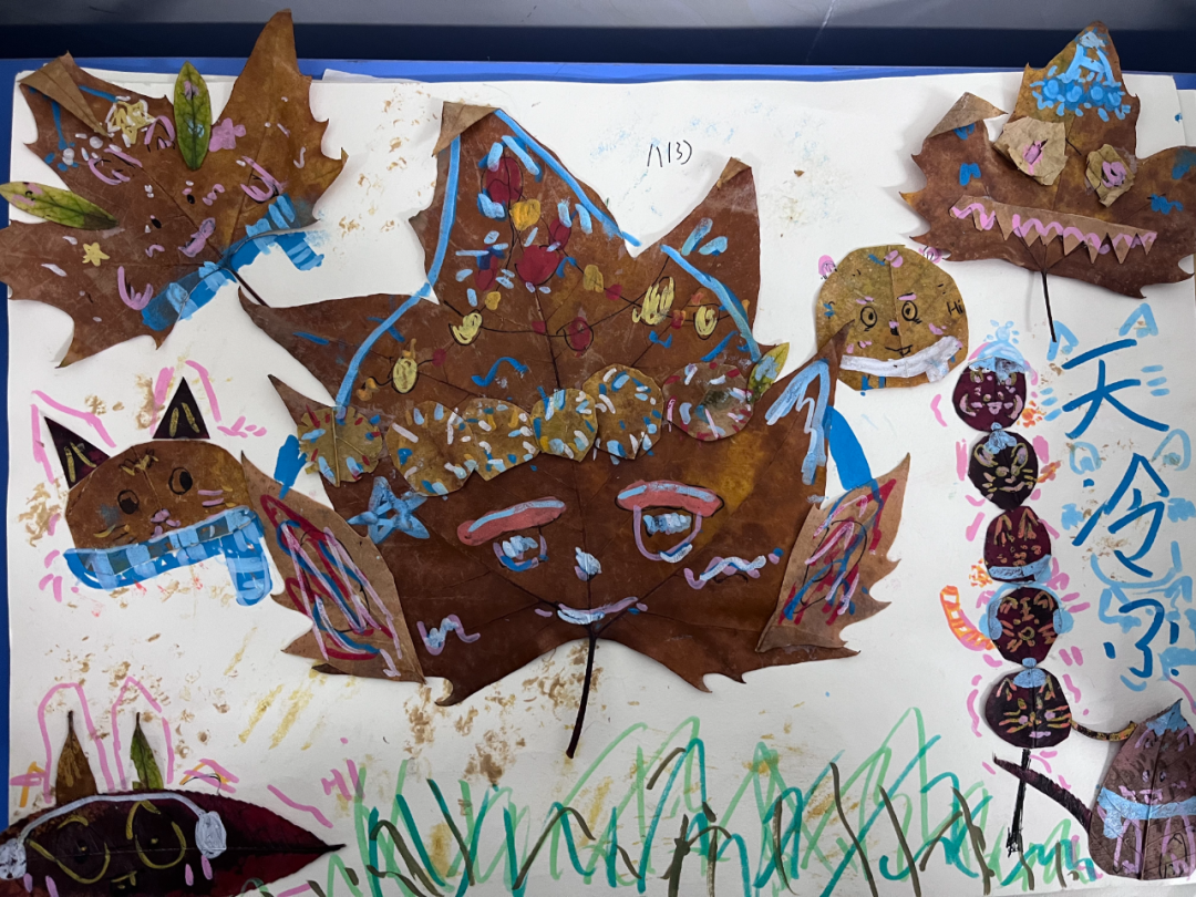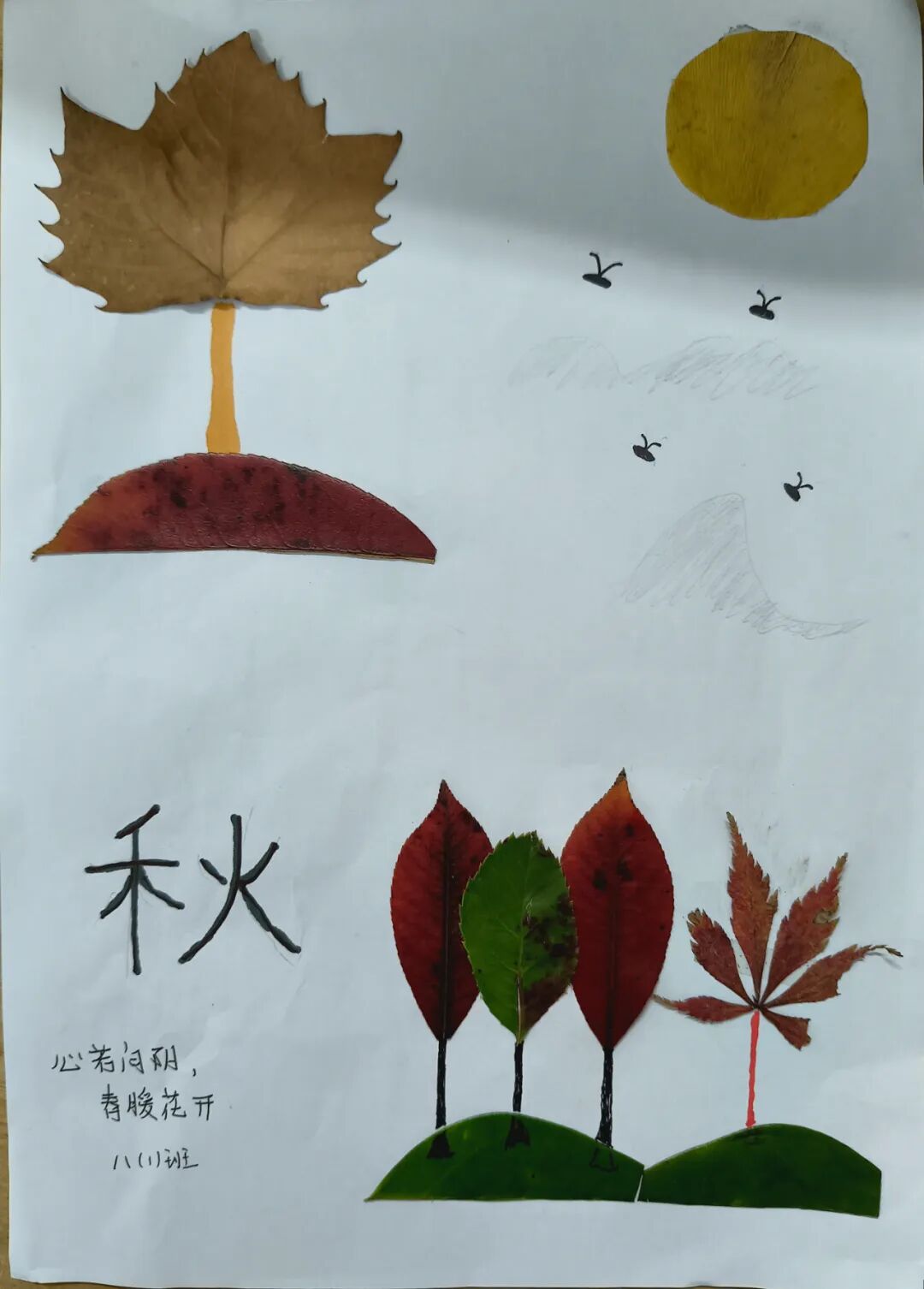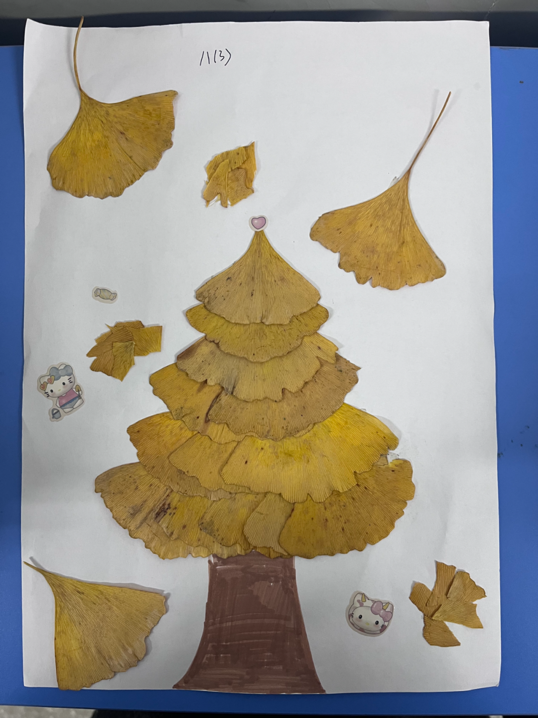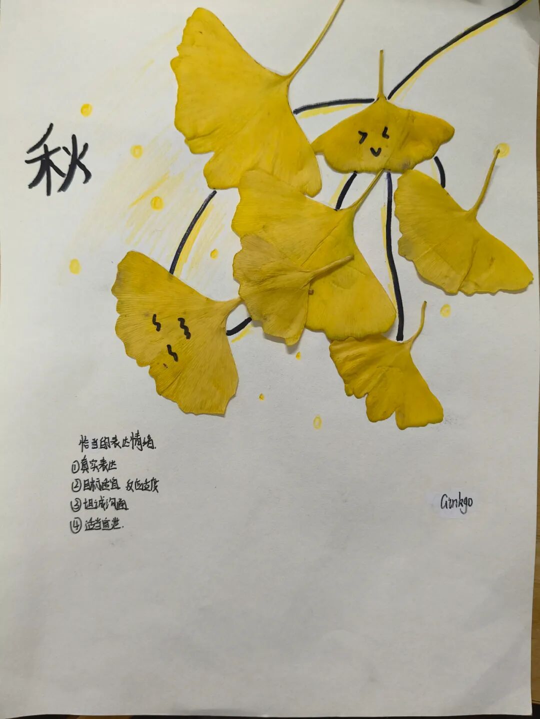 创作环节更是创意迸发。同学们将色彩各异、形态万千的落叶作为核心素材,借助拼贴、绘画、裁剪等巧思,让原本零落的树叶蜕变为一件件精美作品:银杏叶拼贴的蝴蝶振翅欲飞,枫叶勾勒的锦鲤寓意吉祥,梧桐叶裁剪的小船承载憧憬,还有用多种树叶组合成的“秋日森林”充满生机。“我把银杏叶拼成蝴蝶,就是想告诉自己,遇到困难就像叶子凋零,只要坚持,总能迎来‘破茧重生’的时刻。”张梓涵在作品旁写下这样的感悟。