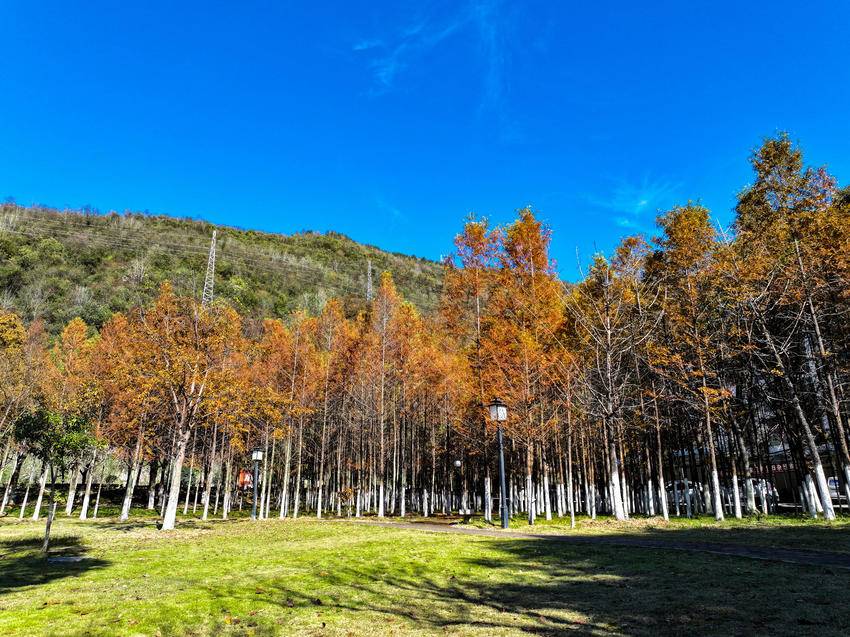 走进城关镇叶家湾小区,草地公园里的水杉挺拔而立,红色树冠与蜿蜒的休闲步道交织,成为居民散步赏景的好去处。