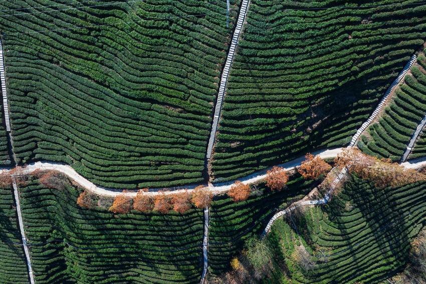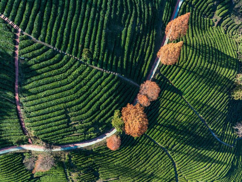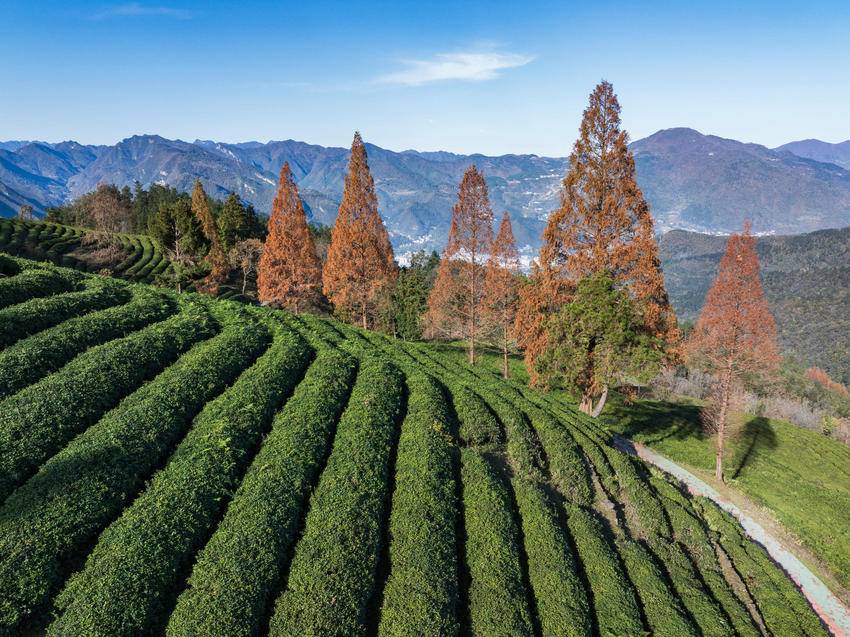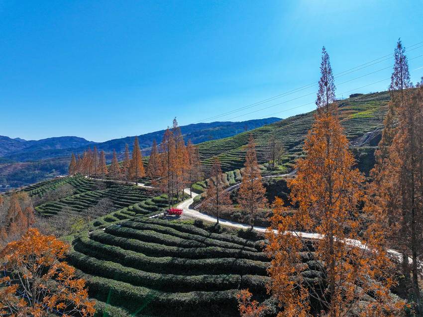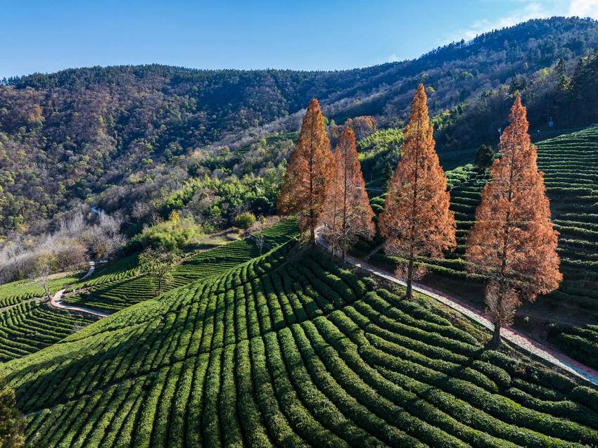 而在官山茶园里的公路旁,斜阳穿过水杉枝丫,将细碎光影洒在层层茶畦间,斑驳交错间,水杉黄中透绿的枝叶更显素净淡然,每一处都藏着冬日独有的诗意。