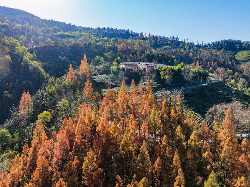 湖北日报客户端讯(通讯员杨韬、邢忆星、田永新)初冬时节,保康县各地茶园、公园的水杉树已换上“红装”。一排排水杉在冬日暖阳下色彩艳丽,景色如画。