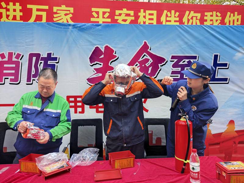 随后,宣传员转入实操教学环节,将理论知识转化为实操技能。在过滤式自救呼吸器使用教学中,宣传员详细拆解撕封条、开盒取器、戴面罩、拉紧头带的快速操作步骤,提醒大家佩戴时需确保面罩与面部密封贴合,避免烟雾渗入影响逃生;在干粉灭火器使用教学中,宣传员现场演示“提、拔、握、压”四步操作法;在消防水带使用教学中,现场演示快速铺设与接口连接技巧。