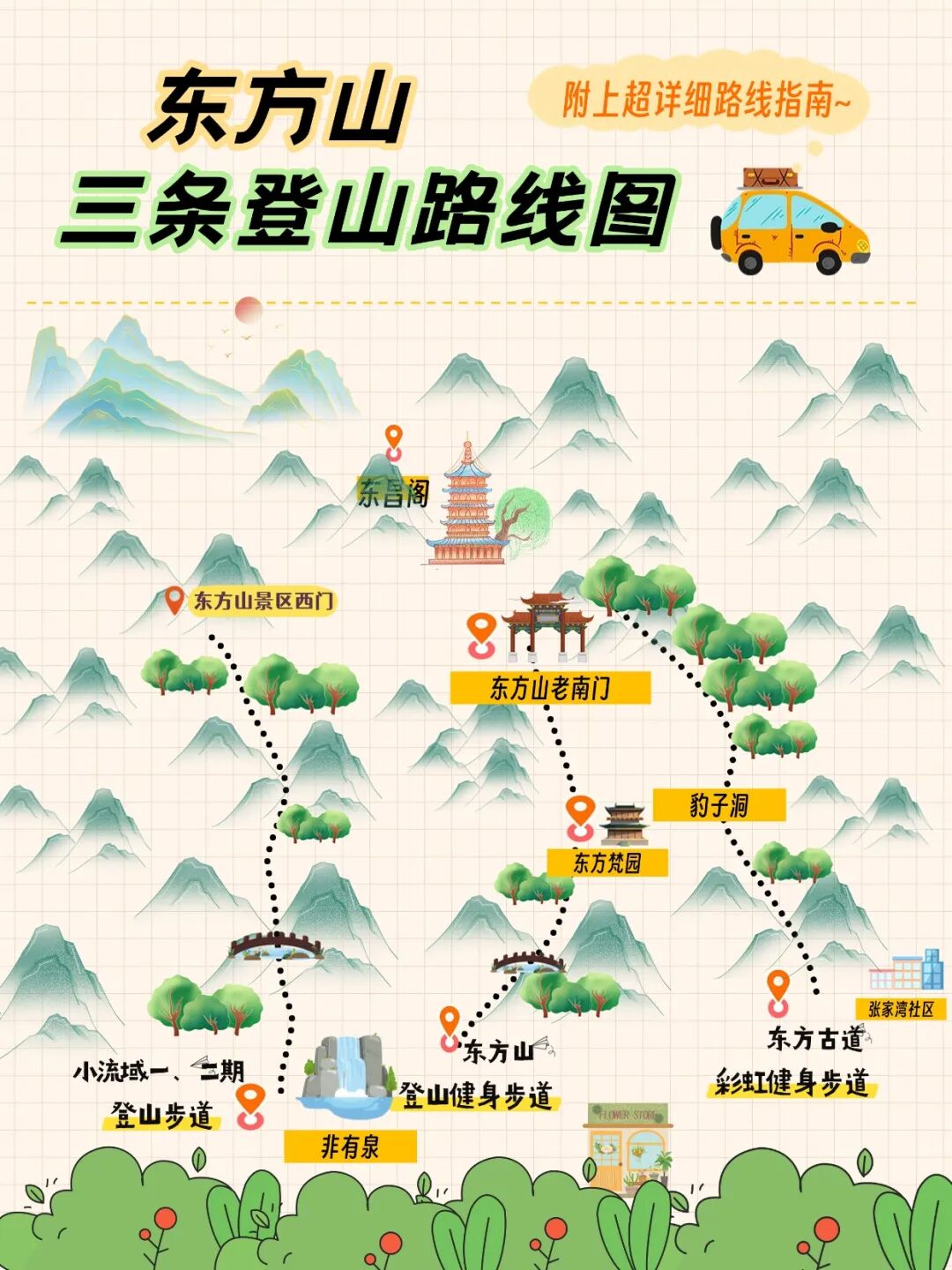 沿步道一路攀登至东方山景区西门公路大门,还可继续前行,向东昌阁顶峰进发。