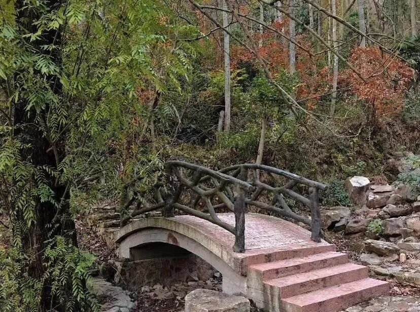 行至中途,一座木质小桥连接着另一侧树林。即便处于枯水期,桥下仍有清泉从乱石缝中涌出。阳光从草叶缝隙漏下,将藏在野地的小沟浸得发亮——疯长的长草如绿墙般裹着窄窄土径,清润的泉水顺着青褐色石面渗成细流,潺潺轻响与草木呼吸交织,尽显山林野趣。