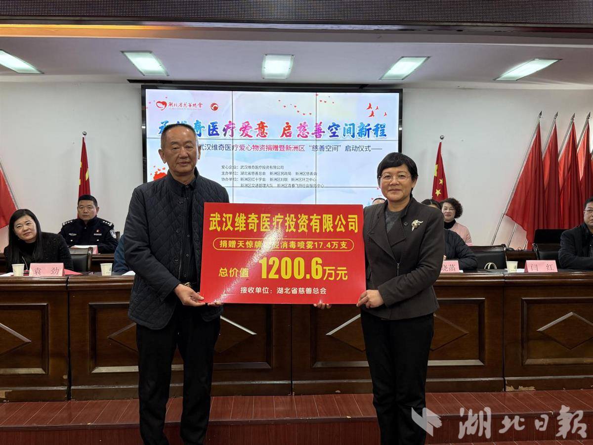 湖北日报讯(记者胡雯洁、通讯员蔡友恒、胡兵)“作为本土科技医疗企业,我们始终坚信,科技的价值不仅在于创新突破,更在于守护民生。”11月20日,维奇医疗爱心物资捐赠暨新洲区“慈善空间”启动仪式在新洲区民政局温情启幕。明峰代表维奇医疗郑重举牌,将总价值1200余万元的爱心物资捐赠给省慈善总会。