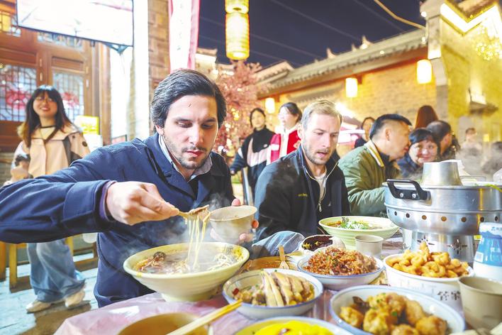 11月20日,外国游客来到襄阳古城管家巷,游览古城夜景、观看传统表演、品尝长桌宴,在美食与文化浸润中,感受襄阳古城魅力。