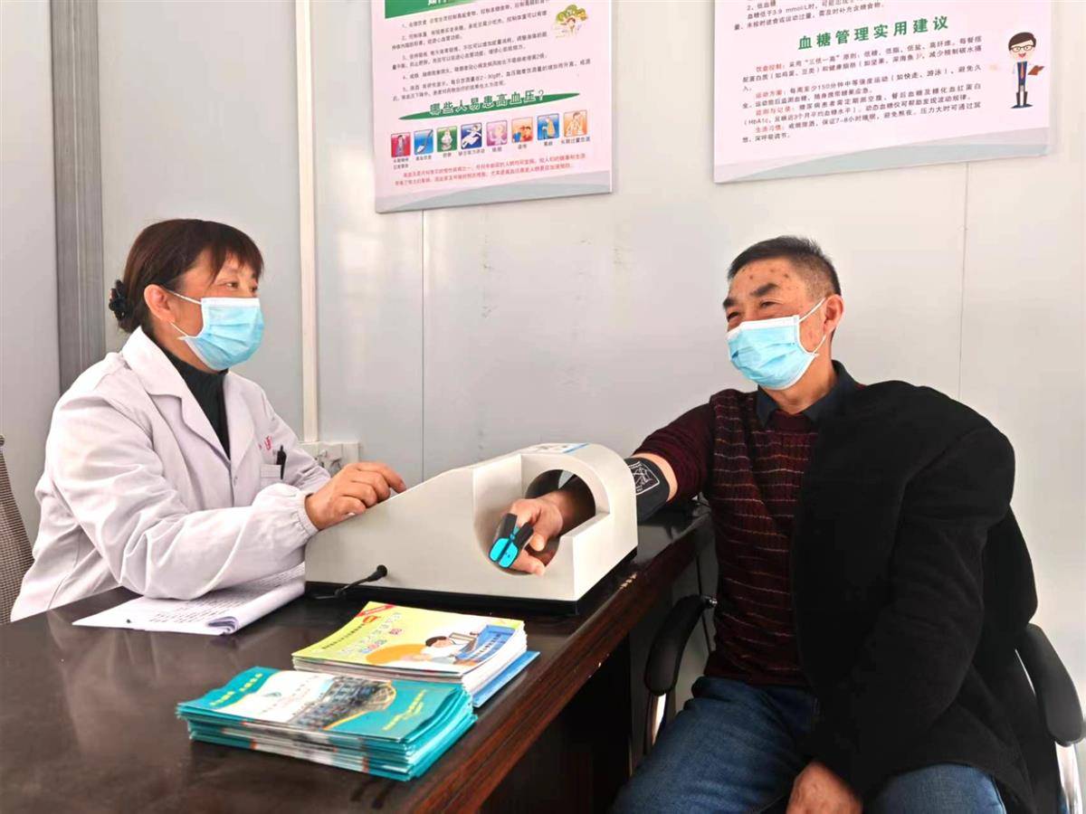 南营街道办事处卫生院护士长刘红艳在健康小屋为群众免费测血压。(湖北日报全媒记者 刘孝军 摄)