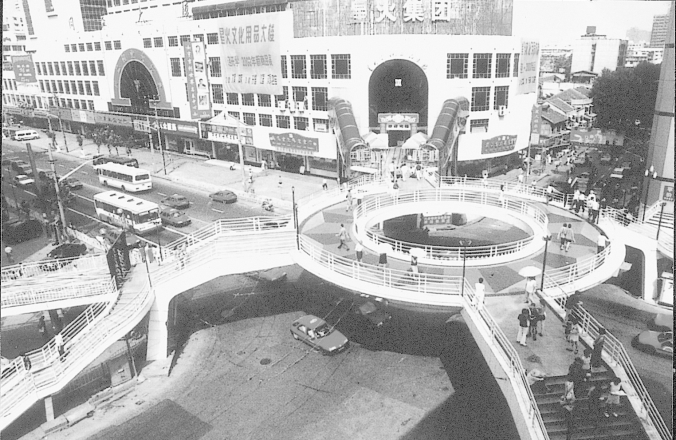 1985年10月,一座大型环形人行天桥架设在中山大道与三民路交叉路口。毗邻的几个商场、楼宇也纷纷以“桥”更名或命名为桥东商厦、桥西商厦、桥南商厦、桥北商厦。