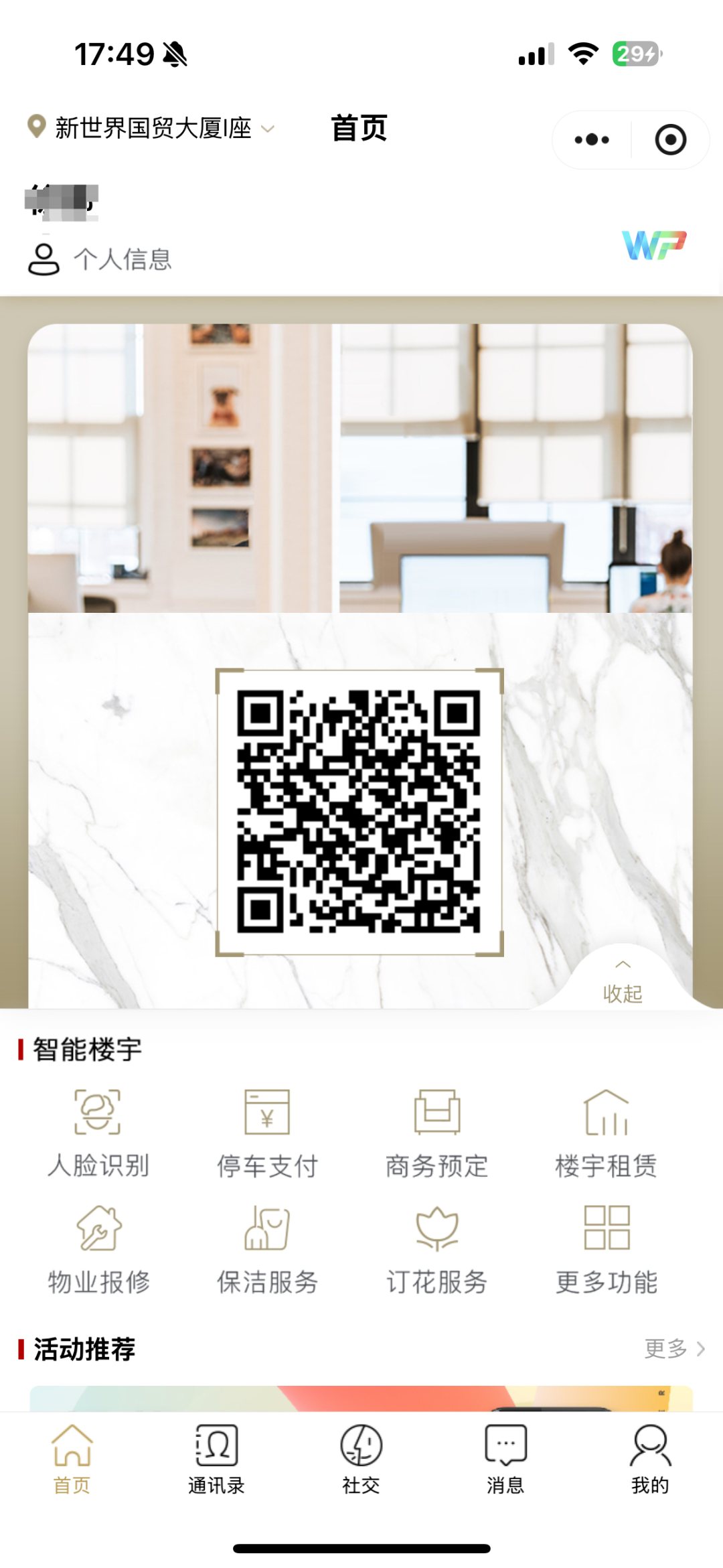2015年,大厦发布自主研发的写字楼租户专属社交软件 WorkPro,并不断升级至3.0版本,通过微信小程序提供职场社交、智慧停车、访客预约等6大专属功能,为企业整合资源、白领高效办公、社交带来新体验,成为楼宇内部的“朋友圈”,让企业与企业、企业与物业沟通更便捷。