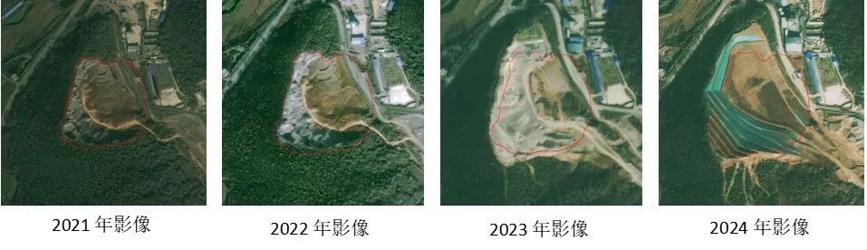 (上图为某历史遗留矿山生态修复进程的时序影像图,2021年至2024年影像特征展现了修复状况。)