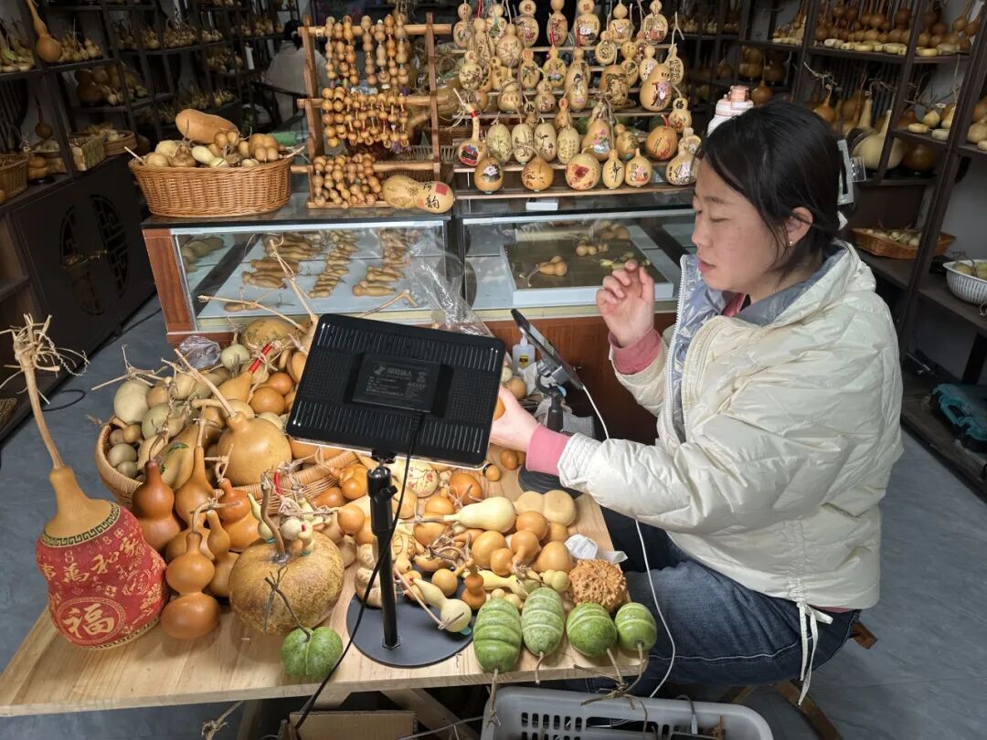 除了外来的葫芦艺人,许多早年间从路庄村走出去的年轻人也选择返乡创业,他们大都有着不错的学历和在大城市打拼的经历:有的是从事金融等行业的白领,回老家后帮助家里做线上直播,销售葫芦;有的是艺术专业的毕业生,建立手工作坊销售自家种植、制作的葫芦制品……年轻人返乡创业让葫芦制品受到越来越多年轻人的青睐。