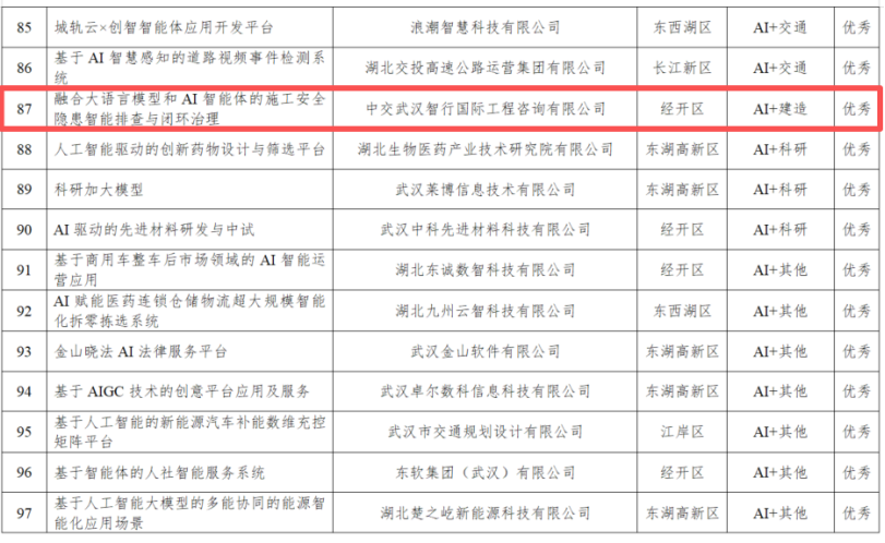 湖北日报客户端讯(通讯员童宪)近日,武汉市经济和信息化局正式公布2025年武汉市人工智能典型应用场景项目遴选结果。经过各企事业单位申报、区级推荐、专家评审及审计核查等程序,位于武汉经开区的中交武汉智行国际工程咨询有限公司(以下简称“智行国际公司”)申报的《融合大语言模型和AI智能体的施工安全隐患智能排查与闭环治理》成功入选,并荣获“优秀场景”称号。