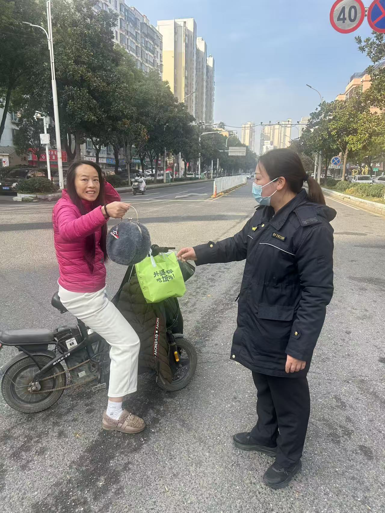 大约十分钟后,一位40左右的女士行色匆匆、满脸焦急地小跑过来,眼睛不停地在路面和四周搜寻着。执法队员张辉立刻主动迎上前询问:“您好,请问您是在找什么东西吗?”果然,这位女士正是手提包的失主。原来,她是一早骑着电动车赶着去上班,途中不慎将手提包遗失,等到发现时已走远了好几里路,这才心急如焚地原路折返寻找。