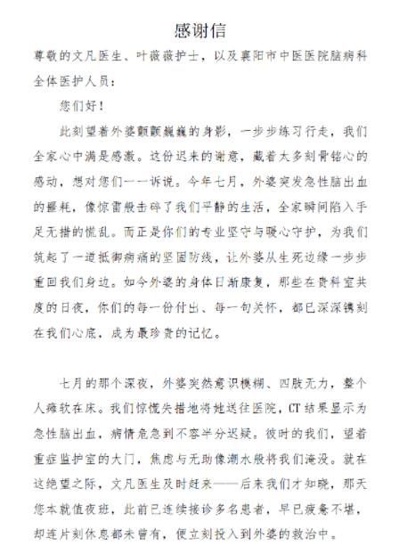 湖北日报客户端讯(通讯员魏晓燕)“正是你们的专业坚守与暖心守护,让外婆从生死边缘一步步重回我们身边……”近日,襄阳市中医医院脑病科收到一封情真意切的感谢信。信中,患者家属以真挚的情感,表达了对该科医生文凡、护士叶薇薇及全体医务人员的深深谢意。