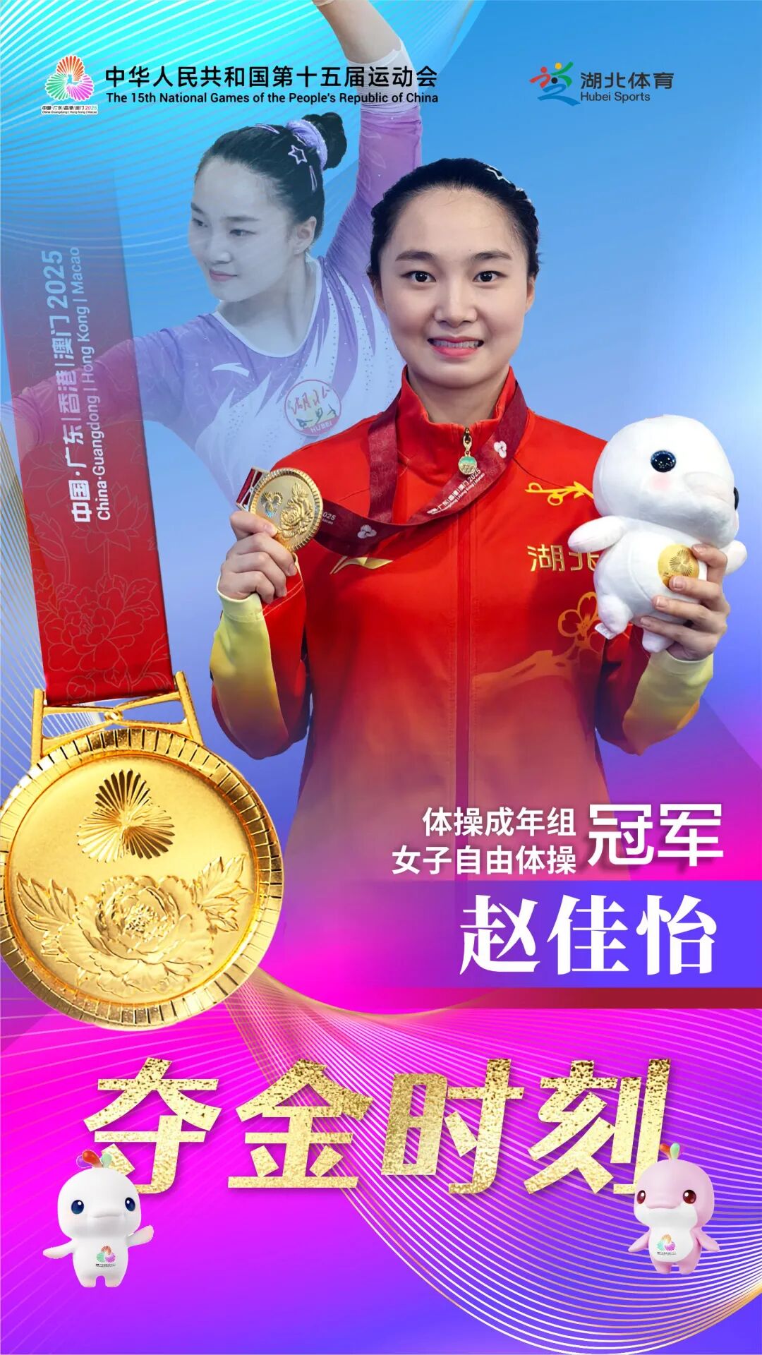 随后,在女子自由操单项决赛中,她又以5.9的高难度系数搭配7.580的高质量完成分,总分13.480分力压群雄摘得金牌,时隔32年为湖北体操再夺全运会女子自由操金牌。