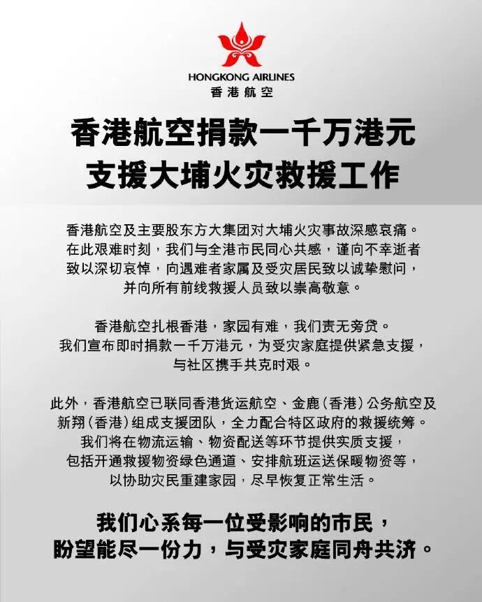 香港航空及主要股东方大集团对大埔火灾事故深表哀痛。在此艰难时刻,我们与全港市民同心共感,谨向不幸逝者致以深切哀悼,向遇难者家属及受灾居民致以诚挚慰问,并向所有前线救援人员致以崇高敬意。